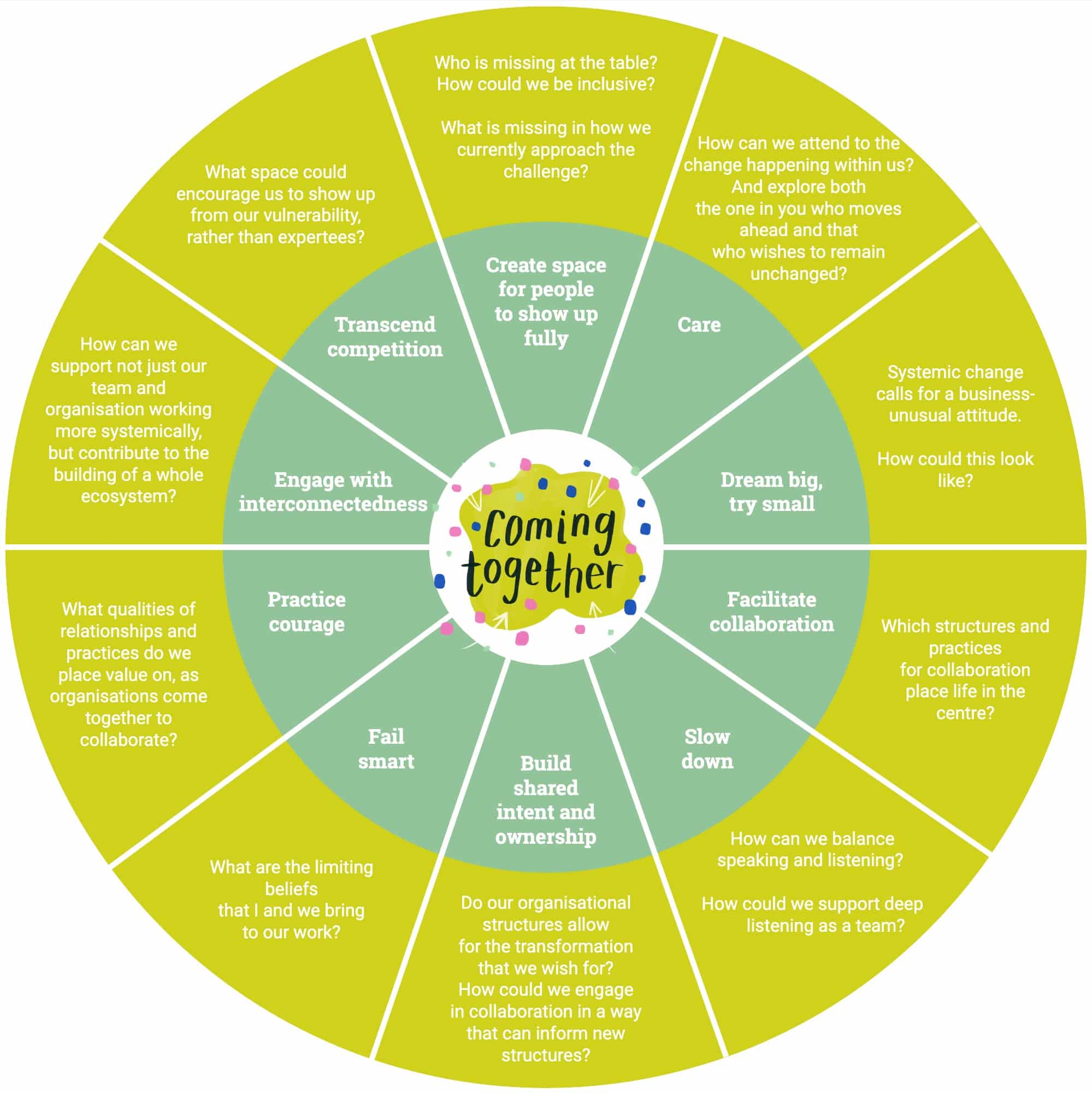 In this spirit, we would love to share with you our interpretation and synthesis of what sprouted in conversations between us. Wheels of evolving practice, we have called them. You will find three sets of action principles with explorative questions linked to them, connected to the subjects of the three days of the festival – coming together, orienting the messy middle, and challenging the way we understand impact. We hope that you might find it useful to bring these with to reflect with yourself, your team, your community.